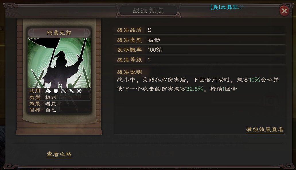 刚勇无前是一个集会心与增伤为一体的战法,其最大的优点就是其增伤稳定性。如果不是使用的武将太局限(基本与张飞稳定搭配),S级别战法必定有刚勇无前一席之位!