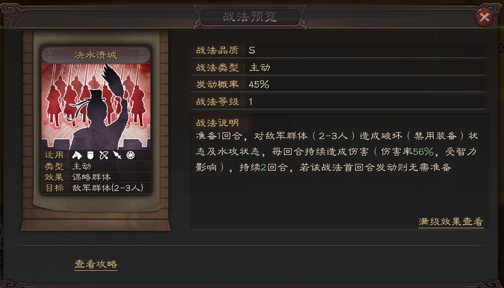 三战游戏中第一个战法可以禁用装备的。不要小看三战游戏中装备的属性加持,好的一身装备,相当于提升武将本本身红度。如果不是该战法为准备类型主动战法,并且发动率未过50%。那么S级别战法也非他莫属。
