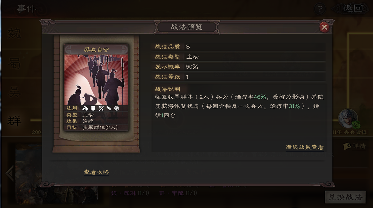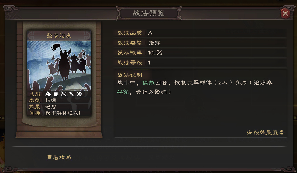 非常高的发动几率,以及不俗的伤害。最重要的是其禁疗效果!禁疗是三战游戏中比较奇缺一类的战法,可以克制许多一线阵容。