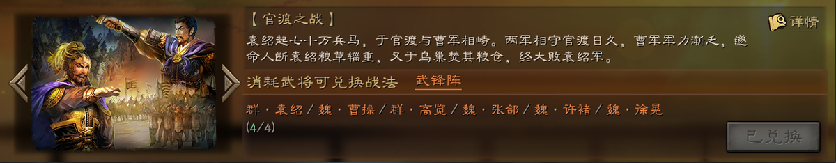 :武锋阵 兑换条件:袁绍、曹操、高览、张郃、许褚、徐晃