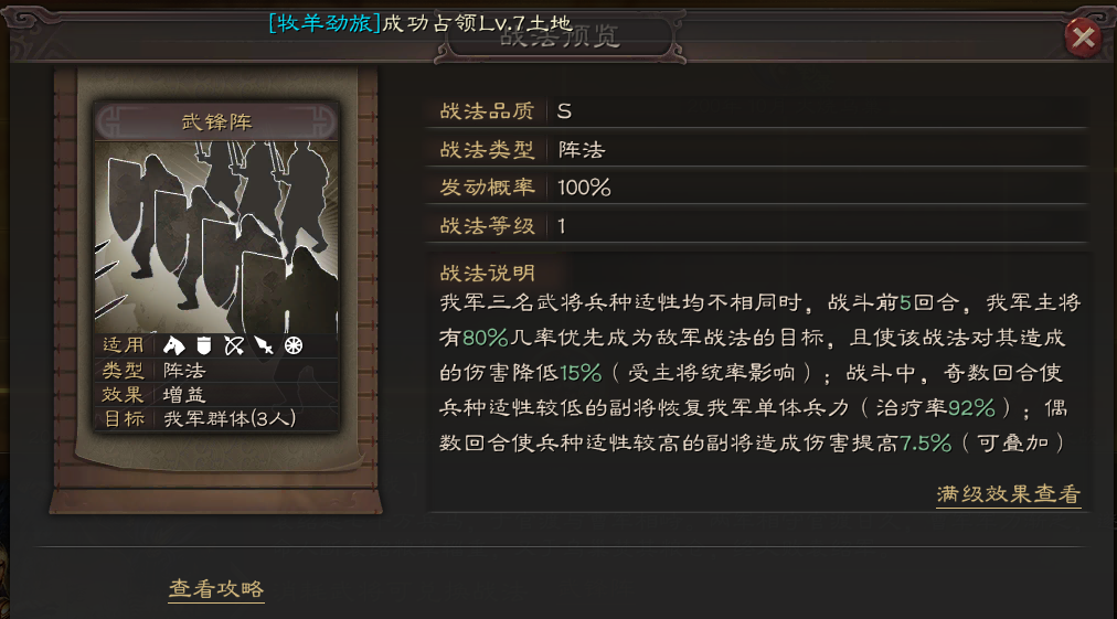 其高额的兑换条件就值得一个A级战法位置,更别说没削弱之前的武锋阵妥妥的S级战法。削弱之后凭借着武锋三仙的大火,也证明着武锋阵也妥妥的A级战法!