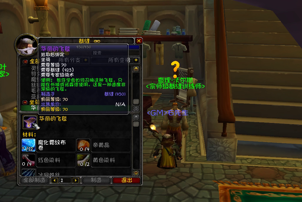 除了属性收益之外,裁缝还可以做一个魔毯,属于飞行坐骑,工程有陆地双人摩托,裁缝有飞毯,这都属于坐骑控的标配。