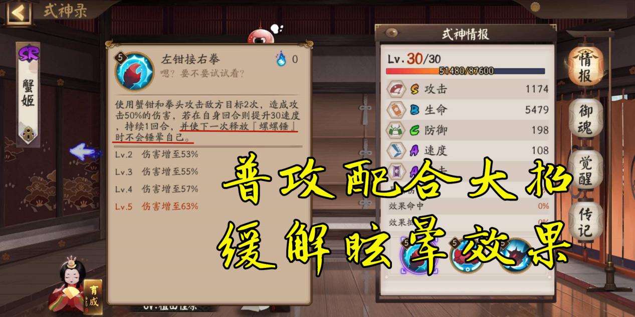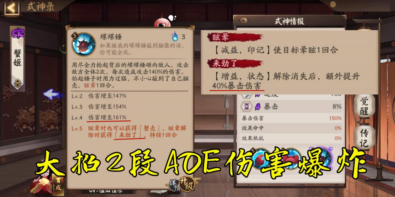 被动技能就是一个减伤的自保技能,没有很特别的地方,选用蟹姬这个式神作为萌新开荒的助力输出,最主要的还是因为大招中的暴力二段输出,用破势套来进行输出,和一拳超人茨木的差别不大,萌新玩家足够用了,因为足够暴力,还有玩家给蟹姬取名"玉藻钳",这个昵称非常形象生动。