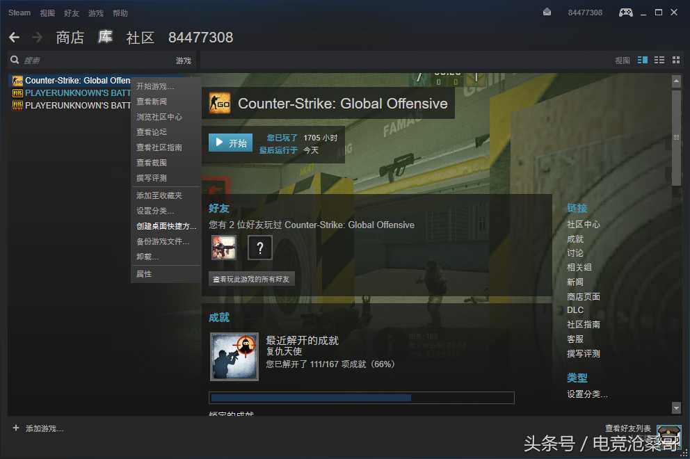 1、首先打开steam后鼠标指向CSGO右键菜单选择属性