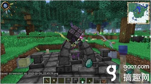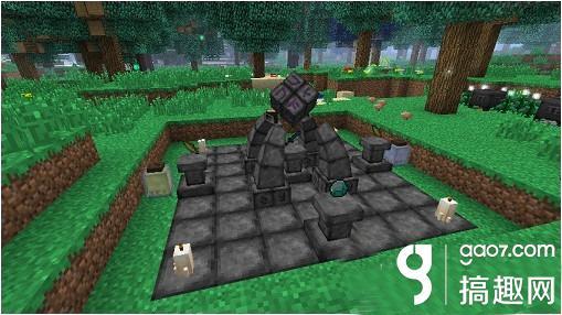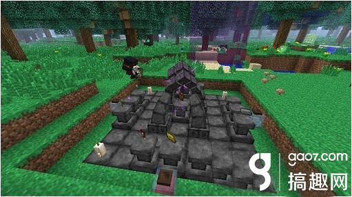 2、然后就看到一团破碎的粒子后,出现了这样的构造,即注魔祭坛。当然,要使祭坛很好的工作,还要在周围布置一下。这里就按神秘书里的示例图布置了一下,周围四个基座上按神秘书的合成图摆上物品,以制作风之利剑为例,展示一下魔法注入的过程。另外。基座上摆放物品和取下物品都是按鼠标右键,同时附近放上所需的元素罐子,风之利剑需要的是空气(Aer)、能量(Potentia)和移动(Motus)。