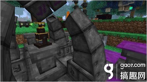3、一切准备就绪后,手持魔杖对着符文矩阵右击,可以看到符文矩阵放射出紫色光芒,从附近的元素罐子里吸收元素,然后吸收4个基座上的物品。