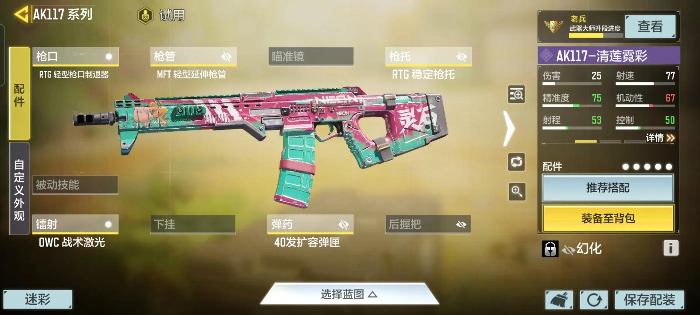 AK117是现代化的紧凑型步枪,一直是新手玩家最喜爱的枪支之一,这把枪以射速快、稳定性高闻名,在近距离作战中可以发挥出其强大的实力,不过这把枪对于玩家的准度是有一定要求的,因为它的子弹不多,上弹速度也比较慢,如果在对战中不能快速击杀对手,那么很有可能会被反杀,这个时候就需要给其合理的搭配配件了。
