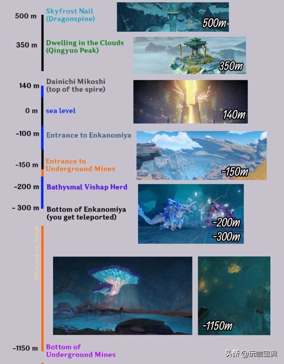 目前,游戏地图最高处为雪山之上的“寒天之钉”,相比之下璃月的庆云顶,稻妻的“天云峠”都是更低一些,但从视觉效果上说已经很高了。最新的地图渊下宫纵深看上去是高处有140m,低处有海平面下2-300m。而层岩巨渊的纵深是上面的两倍。所以还是比较好奇2.6会如何表现出地下世界的深邃。