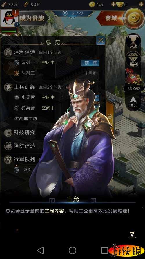 你发现总览表的好处了吗?为了让你更加合理的利用时间,从而能够尽快发展起来。如果你不知道下一步该干什么的时候,你只需点击总览即可一目了然。特别是对与新手玩家而言,哪个建筑物有空闲的队列,可以训练哪些兵种等,都能够及时管控,在同一时间内,轻松的将战力全面提升起来。
