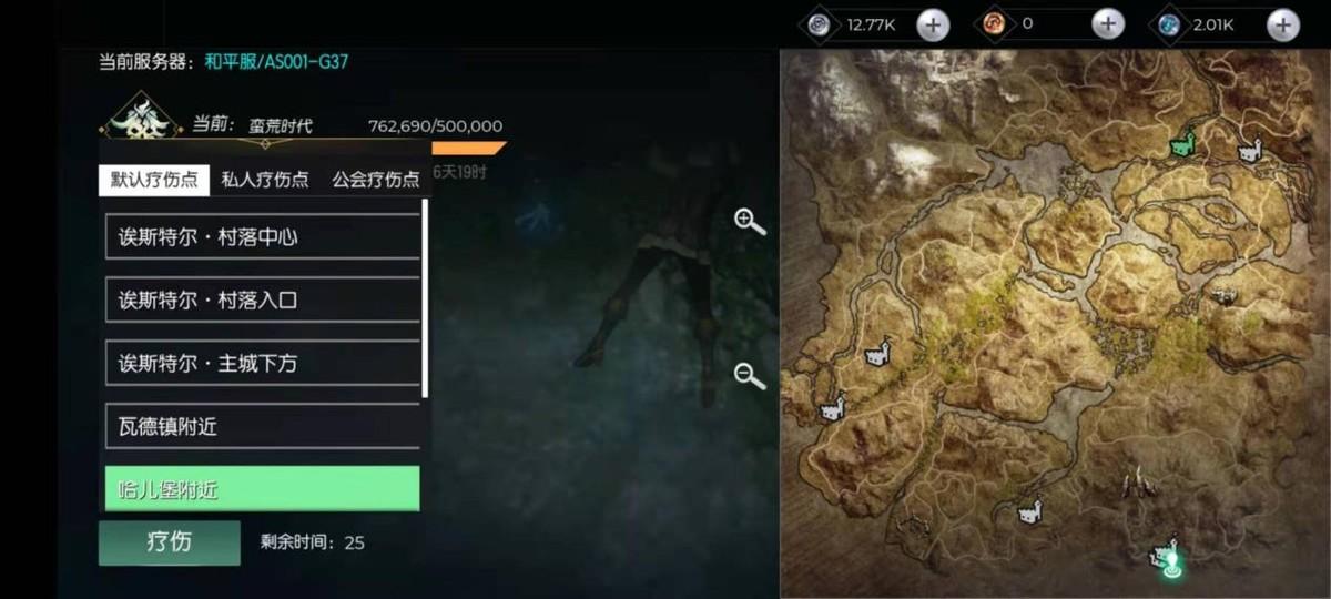死亡后能看到默认疗伤点、私人疗伤点、公会疗伤点,我们选择默认疗伤点,然后选一个靠近河流的地方复活,比方说哈尔堡附近就不错,选择这个地方复活。