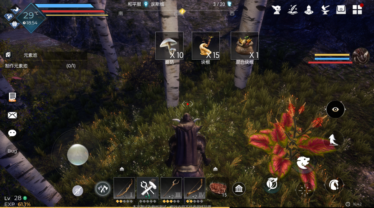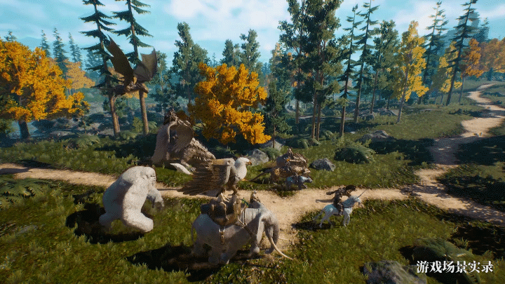 骑上野猪,然后到花簇、干草丛、芦苇等低矮植物上,点击资源采集,就能采集到的蘑菇、块根等资源了,可以用于加工成高级食物。