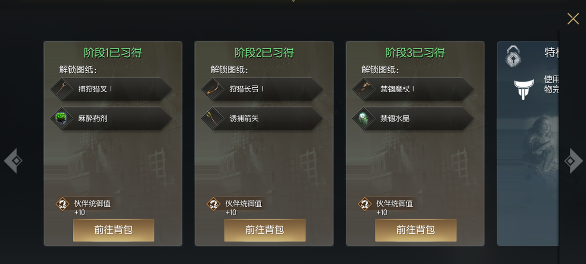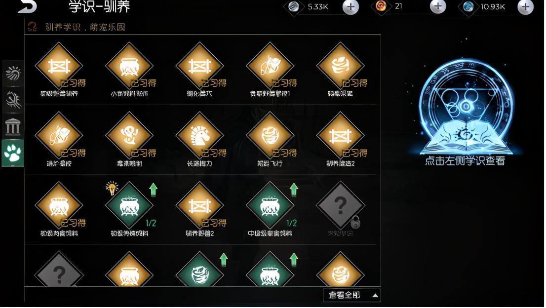 驯服野猪的前提是玩家解锁初级野兽驯养学识,10级后就可以研习,我们解锁到第一阶段就行,可以制作出捕兽猎叉和麻醉药剂。