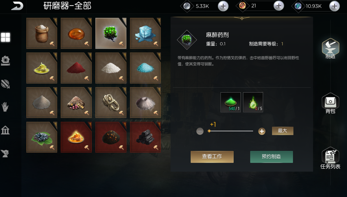 之后在背包里制作出捕兽猎叉,然后在研磨器里制作出麻醉药剂,建议麻醉药剂制作个数十个。