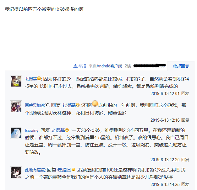 在贴吧之中他表示在以前高勋章的结界突破是非常多的,而现在却这么少了是什么原因?有的痒痒鼠表示你刷的太少了,所以匹配的结界都是非常弱的那种,但是也被该大佬瞬间反驳。因为在以前的时候高勋章都是非常多的,而现在却没有这么多就觉得非常奇怪了。