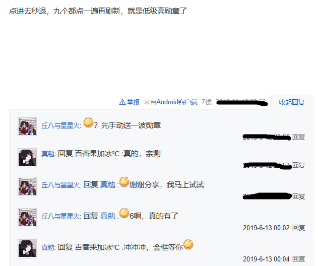 先点进去秒退,九个都这样做然后再刷新,就能够低等级高勋章。如此一来不仅仅能够获得更多的勋章,而且还是非常容易的那种,就这样痒痒鼠试了一下,发现这个套路确实可行。