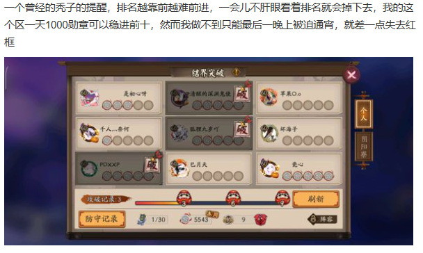 这种事情在各大交流平台之中也有不少的议论,虽然老咸鱼玩家们众多(就比如我这个老咸鱼。)但是也阻挡不住那些秃头大佬们的冲击。一位痒痒鼠就在贴吧之中说了这个事情,因为他已经无法再刷到更多的个人结界高勋章了,对此一直是非常苦恼。