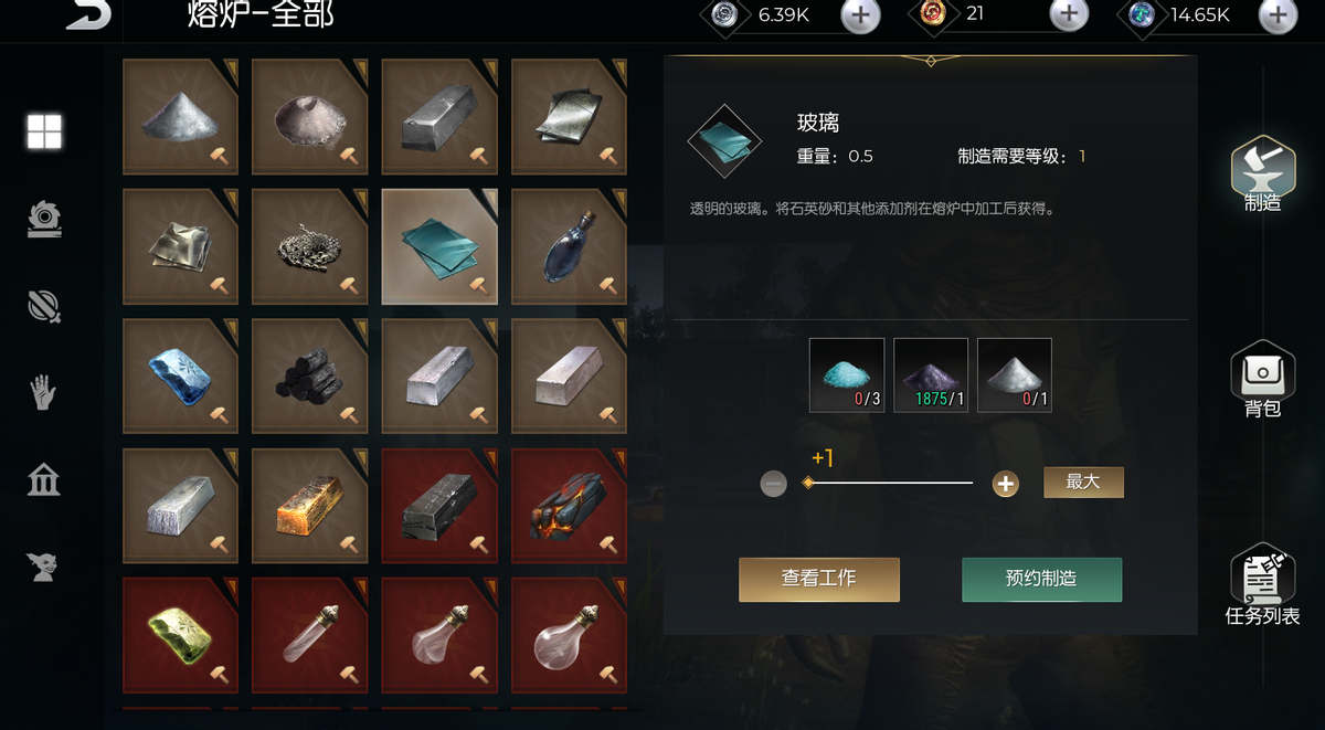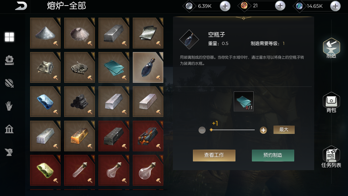 我们可以在游戏里制作出玻璃瓶来快速获取水珠,要先解锁“熔炼与锻造”学识到第二阶段,就能学会制作出玻璃了。