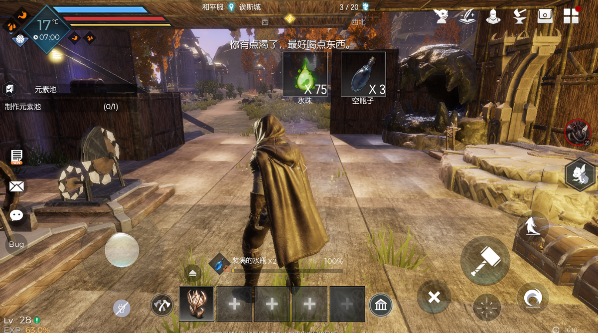 带上空瓶子在水源地可以灌满,我们可以一次性制作出几十个空瓶子来装满水,然后需要用的时候再背包分解装满的水瓶,分解一个能得到25滴水,分解20个就能得到500滴水,很方便。