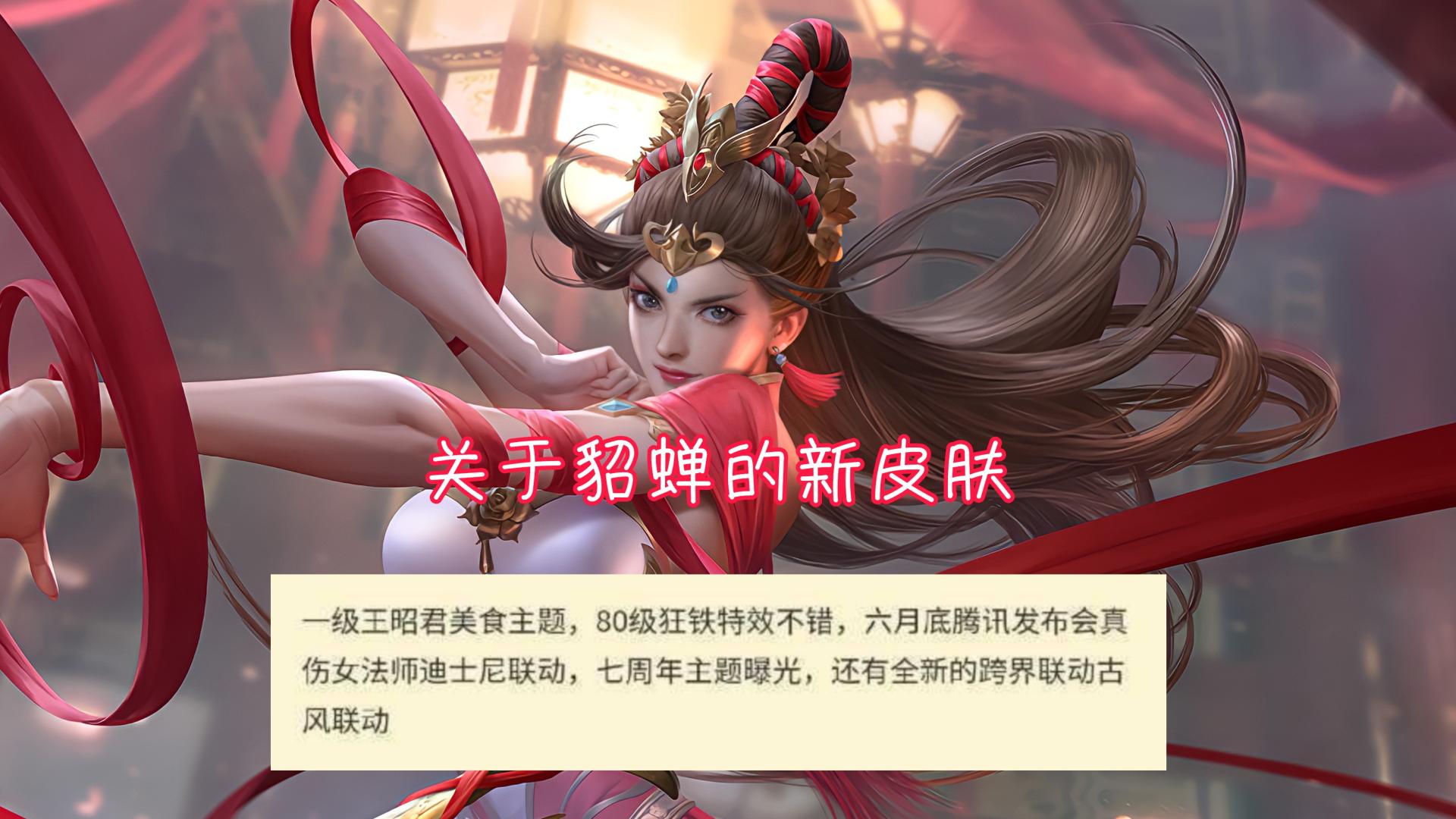 因为腾讯游戏发布会将会在6月底进行,刚好有大佬爆料,貂蝉的迪士尼联动也会在游戏发布会进行公布,据说到时候还会公布王者荣耀的周年庆皮肤。
