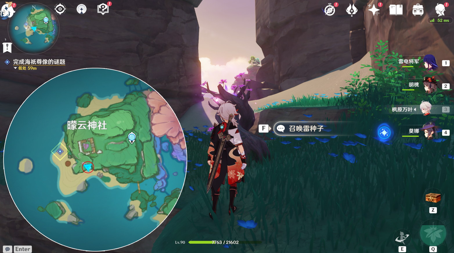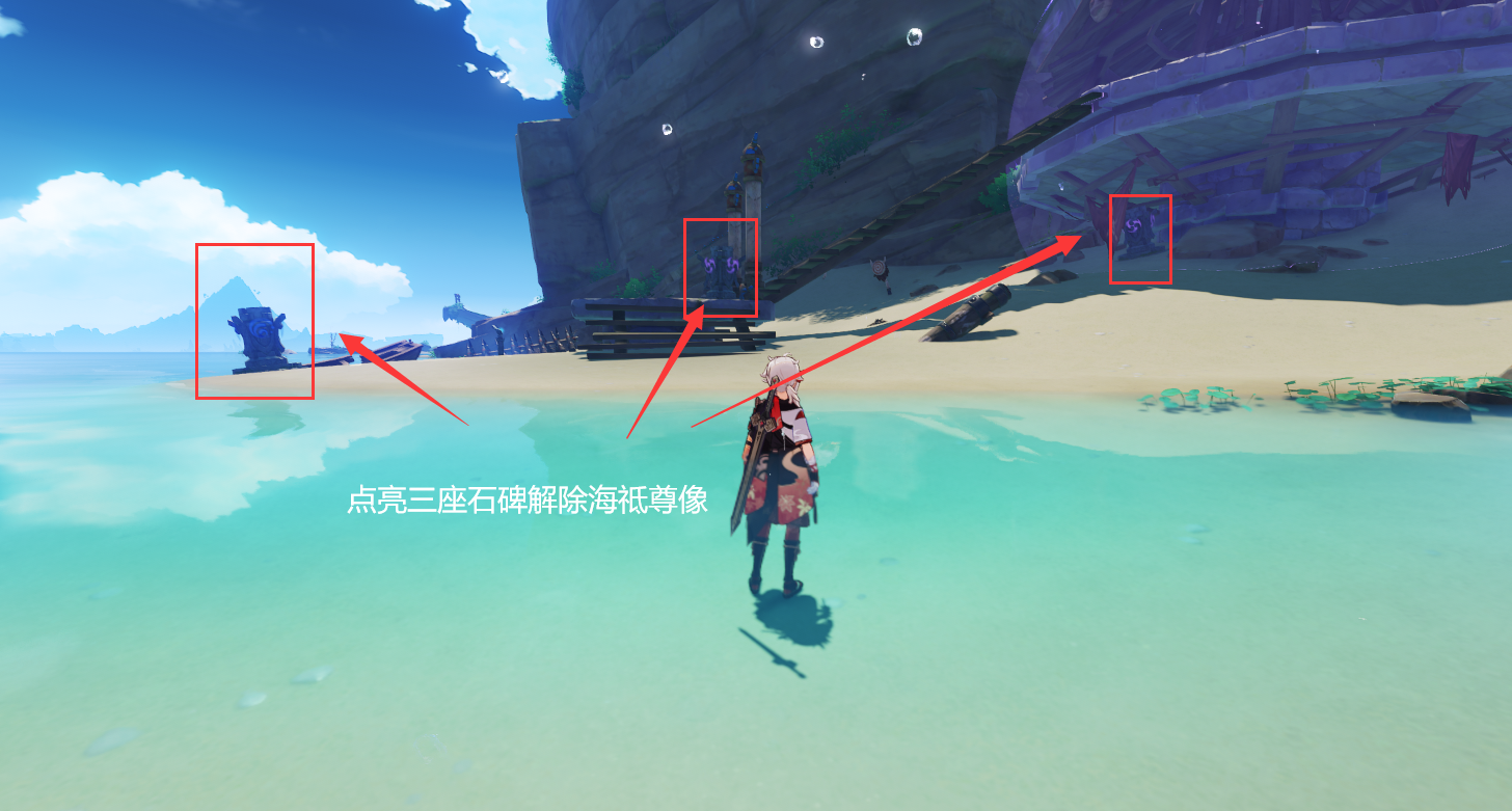 解谜题:1,点亮三座元素石碑,即可解除海祗尊像,最右边有雷屏障,旁边山坡可以获取雷种子进入屏障,
