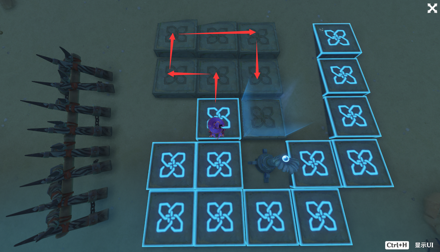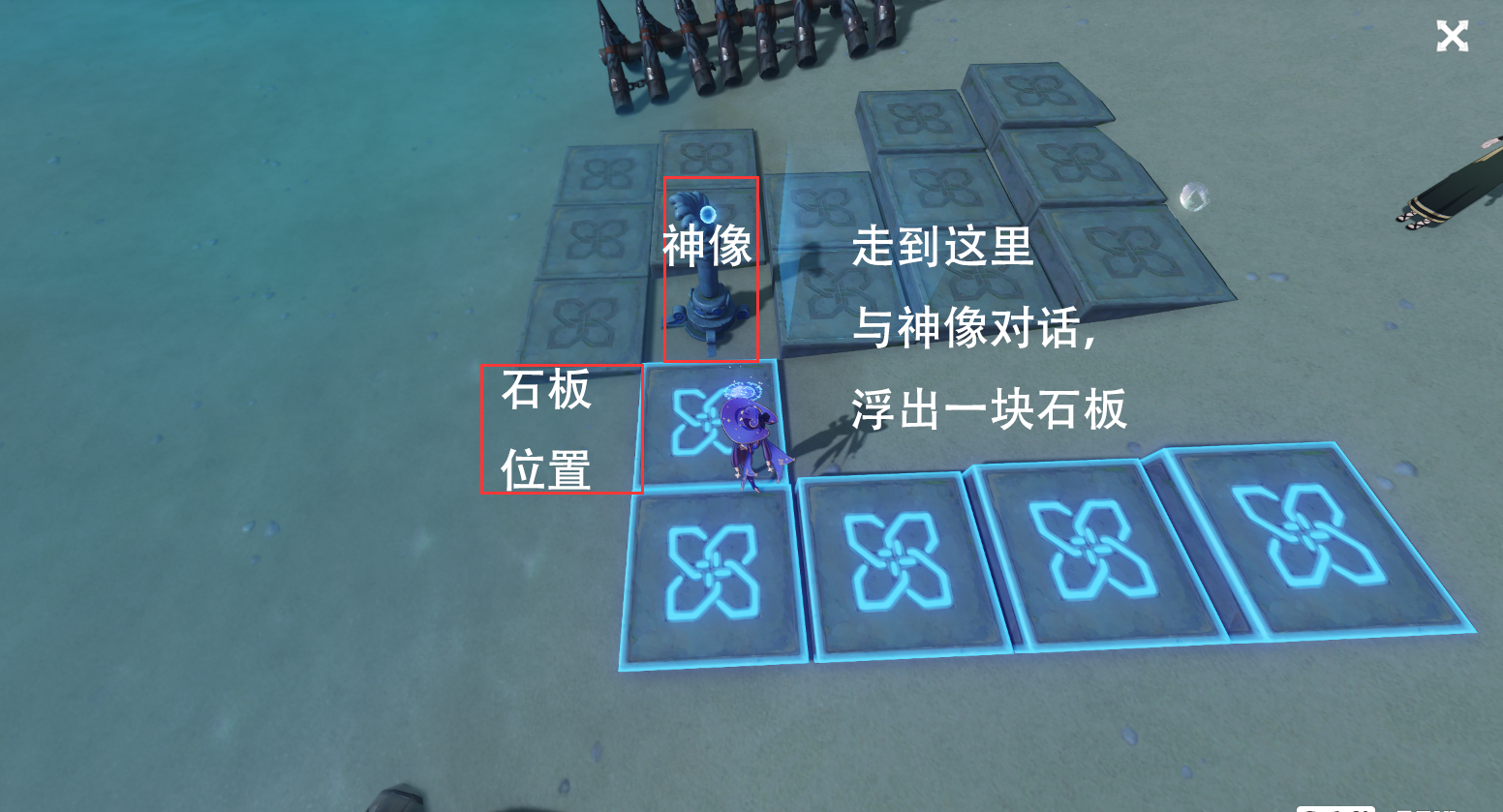 解谜题:2、一次性踩亮所有石板即可破解,