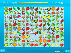 大家可以看到进入游戏页面的首先会看到上方有时间的进度条,这就意味着需要在这个时间段内达到过关所需的分值才可以,所以,当你已进入游戏一定要抢时间,先将中间所有同样的水果或蔬菜快速的进行消灭,再四周周边的同样的水果或蔬菜进行消除,在这样操作的同时也需要关注所有尽可能可以消除的其他类型水果或蔬菜,这样第一级别就很容易