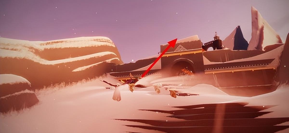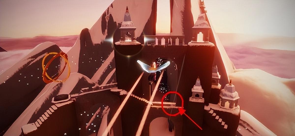 5、玩家进入门后一直向有建筑的地方飞,也就是【霞光城堡】,根据我箭头指示的地方,这是【霞谷拱门上冥想】的地点。