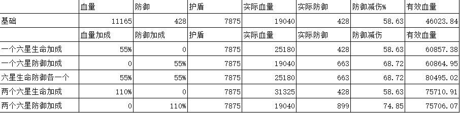 可以列举一个表格来看看数据,设定最初血量为11165,护盾值为7875,基础防御为428,来比较最终有效血量的变化,更为直观。