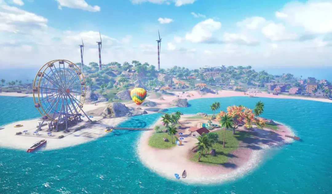 来到位于度假岛地图南部的“粉红沙滩”,远远就能看到拥有粉色砂石的爱心岛、巨大的热气球和炫目的摩天轮等一系列景点。刚刚还在外面刚枪跑路,突然误入这样一个世外桃源般的海岛主题乐园,着实让人有些恍如隔世。