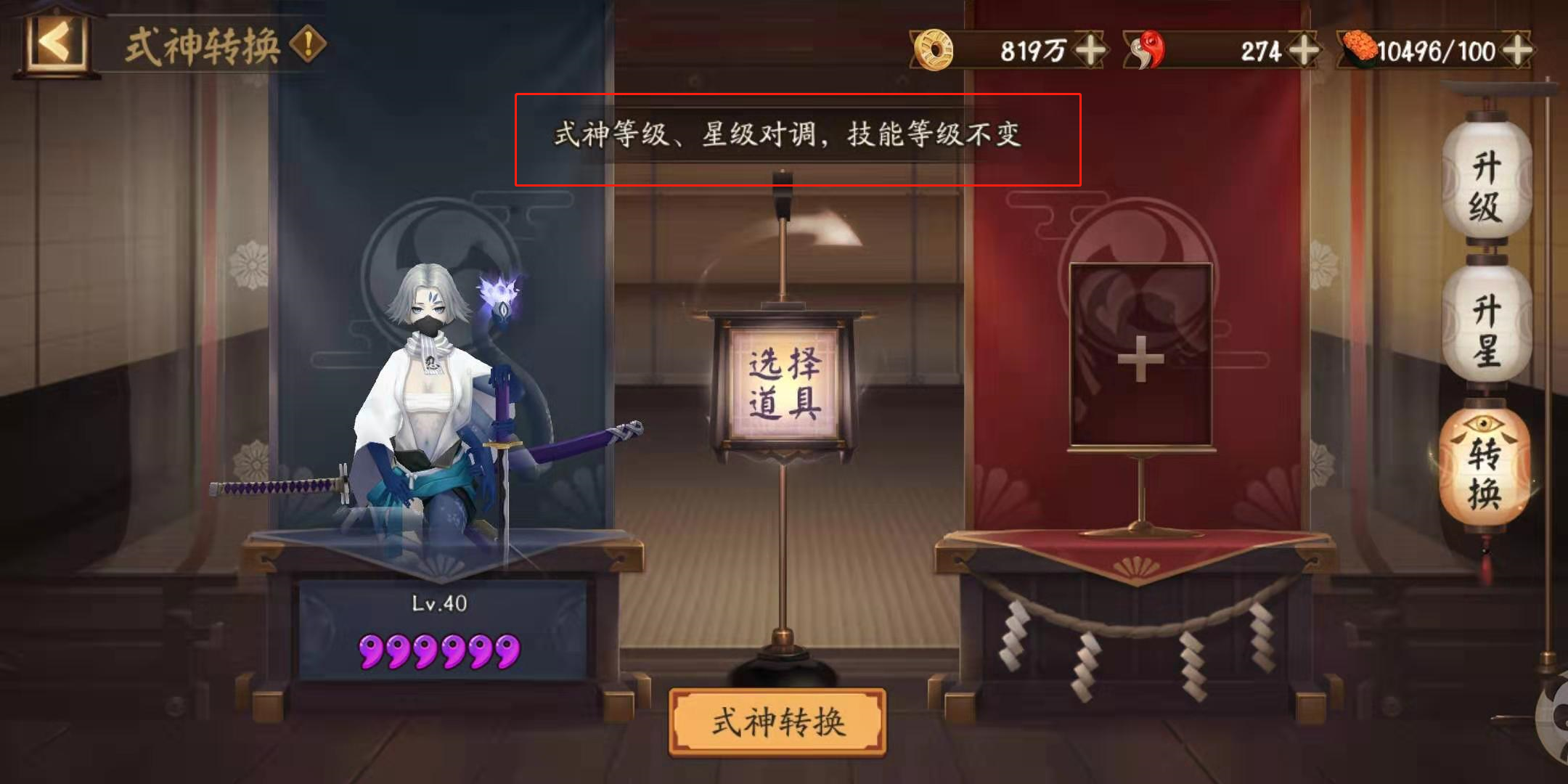 然后来说一下六星转换券的用法,其实除了六星转换券还有五星转换券,用法都是一样的。转换券可以把一个六星式神和一个非六星式神的等级进行转换,转换之后非六星式神继承之前六星式神的星级和等级,反过来六星式神也是一样,但是式神的觉醒状态和技能点是不能转移过去的。