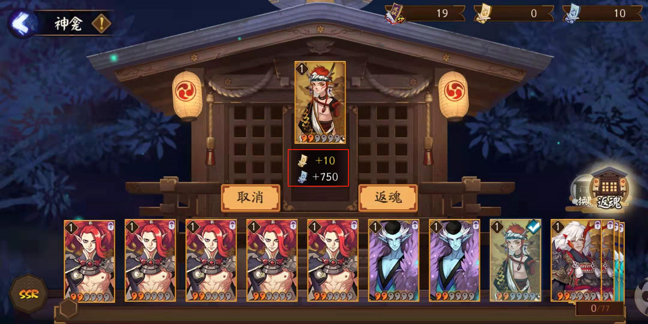 一个六星转换券需要用到2个金御札来兑换,这个兑换的条件还是很简单的。金御札需要返魂分解SSR或者SP级别的式神才能获得,返魂一个SSR/SP可以得到750个御札+10个金御札,这样看来稀有式神真的很值钱。最重要的忘了说,两面福被分解只能得到500御札+10金御札,这个佛爷有点惨,不过两面福技能改了以后,返魂的就少了,都拿去升级技能了。