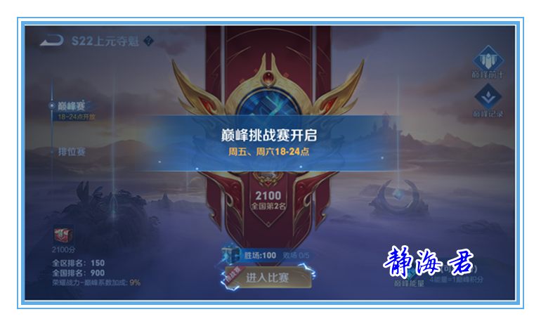 如果你的巅峰积分在0~2099之间,那么你就可以在每天的12点到24点之间参与巅峰赛。