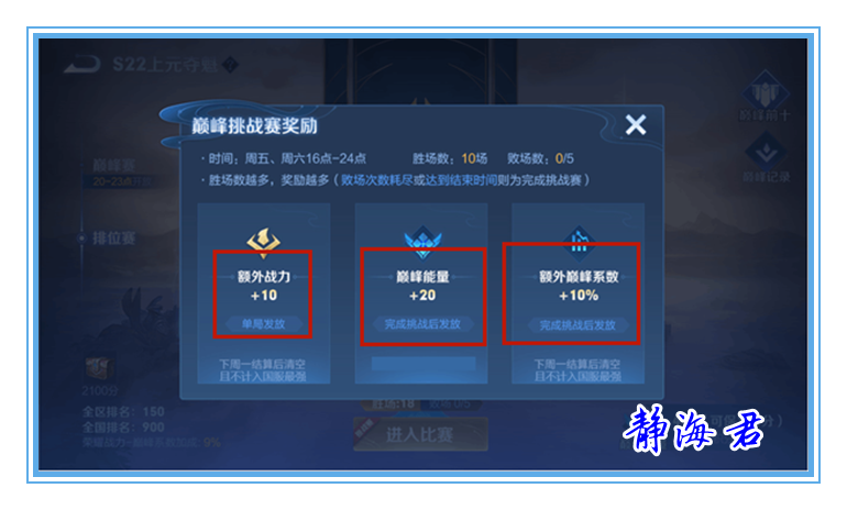 第一个奖励:巅峰战力。参加巅峰挑战赛后,使用的英雄每获得一场胜利就可以额外获得150点巅峰战力,上限为1800点。需要注意的是,额外增加的这个巅峰战力会在每周结算排名后清空,也就是时候只能持续一周,并且,这个积分是不计算进国标排行的。