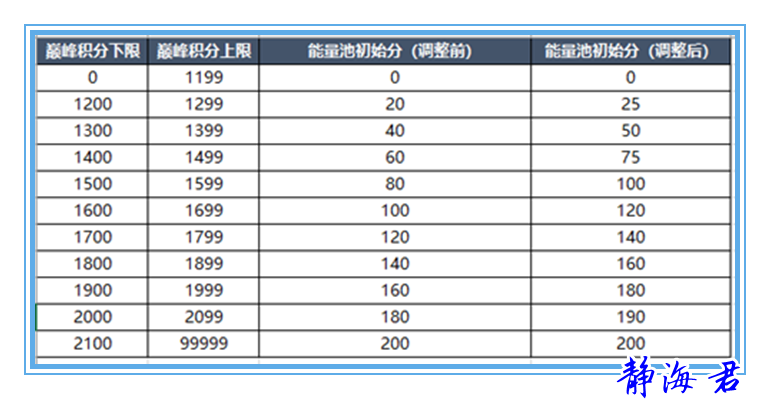 在下赛季调整后,游戏结束后金牌获得的巅峰赛能量数值从6降低到5,银牌从3降低到了2,并且能力池的初始积分也有了调整,具体如下图。
