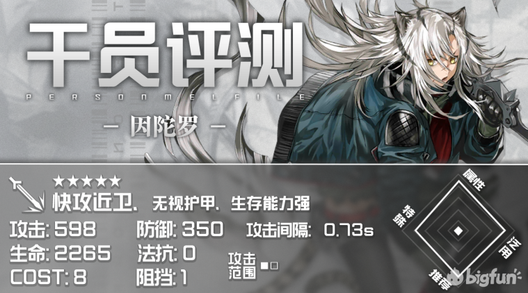 高生存对高护甲敌人可单挑用低费近卫,不是必须的,在特定场合发挥的效果可能也不会很特别明显,但属于功能型的棋子,迟早要练一个备用。看似攻速快很特殊,实际上芙兰卡可以部分替代,个人认为泛用性上要比芙兰卡高,我更推荐因陀罗,当然有爱练啥都行。