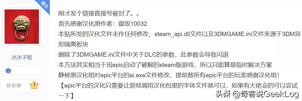 关注并回复“异形”查看Epic版本可运行的汉化补丁,使用方法:下载下来的文件解压缩复制到游戏根目录覆盖游戏原文件。测试之前记得备份记得备份记得备份。