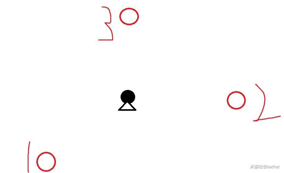 如图所示,我们假设黑球为科斯魔,其三角为正面,则转阶段的三个球大致位置如图,之后依照我图中所标位置依次出现,故依据此顺序来进行破球。