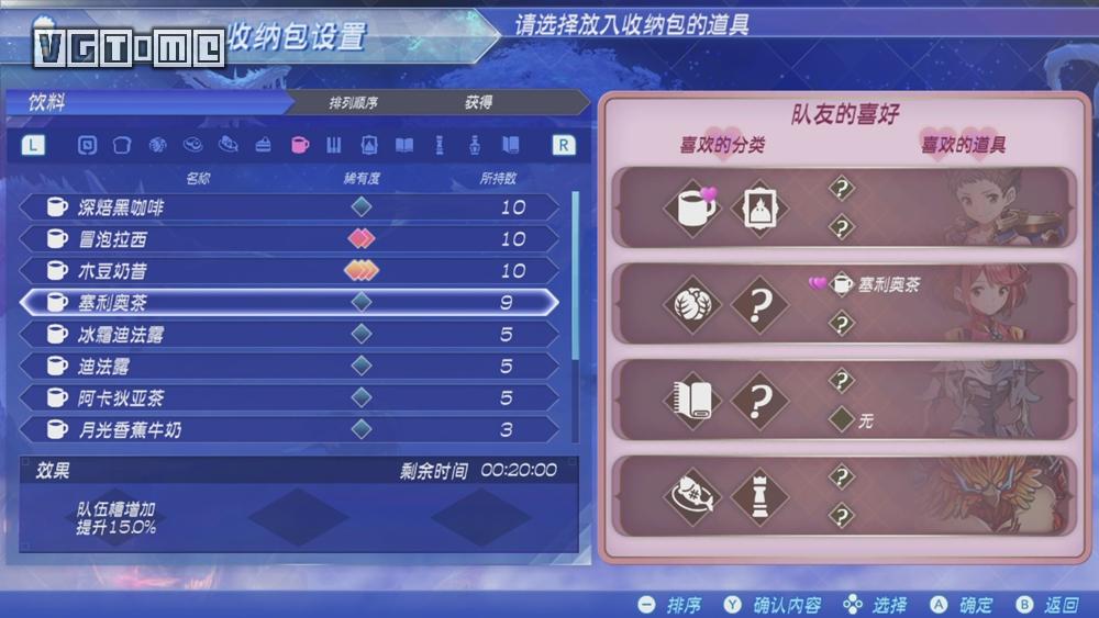 焰喜欢蔬菜类道具、喜欢塞里奥茶,那么把这些道具放进收纳包,都会提升她的信赖度。