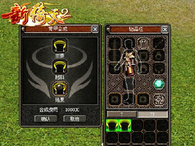 《新倚天2》的背甲装备分为“华丽”、“稀有”、“上古”、“传说”四个等级,背甲等级越高,其外观就会越华丽,同时也会拥有更高的属性吸收率。通过背甲合成可以提高背甲的等级,玩家可以找各国主城的NPC“背甲大师”进行背甲合成。两个相同等级的背甲可以合成一个更高等级的背甲,合成时有一定的失败几率,但是无论合成成功与否,作为主装备的背甲均不会消失。
