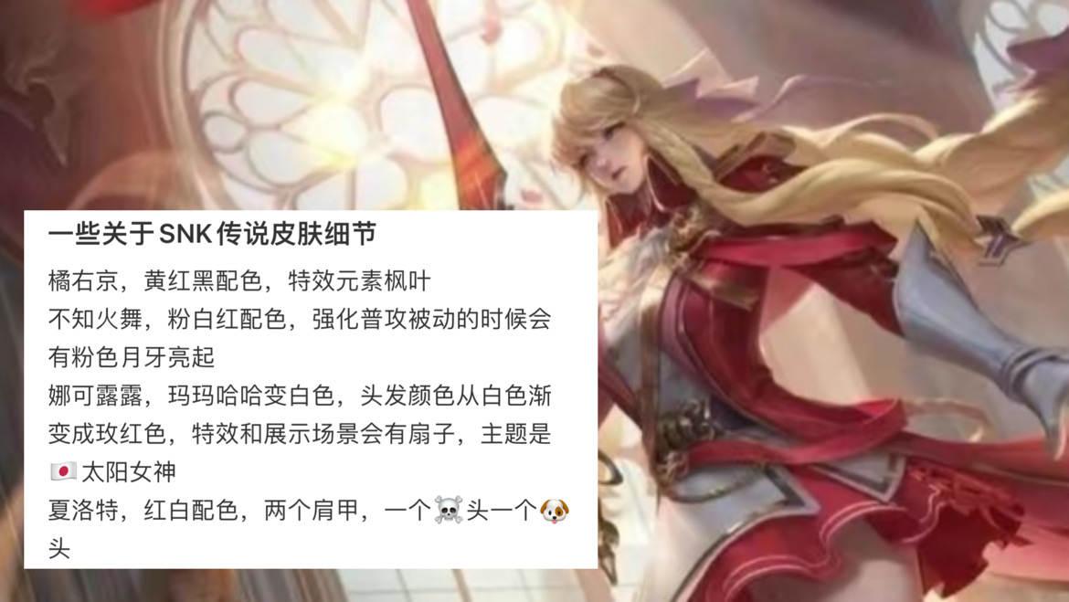 如上图所示,网友爆料了四款SNK英雄的传说皮肤设计,火舞的皮肤是粉色配白色,橘右京的黄红黑三种颜色,娜可露露的应该是白色,夏洛特是红色搭配白色,这几款皮肤中,有两款很快就会上线,就是橘右京和娜可露露的,官方已经暗示过了。