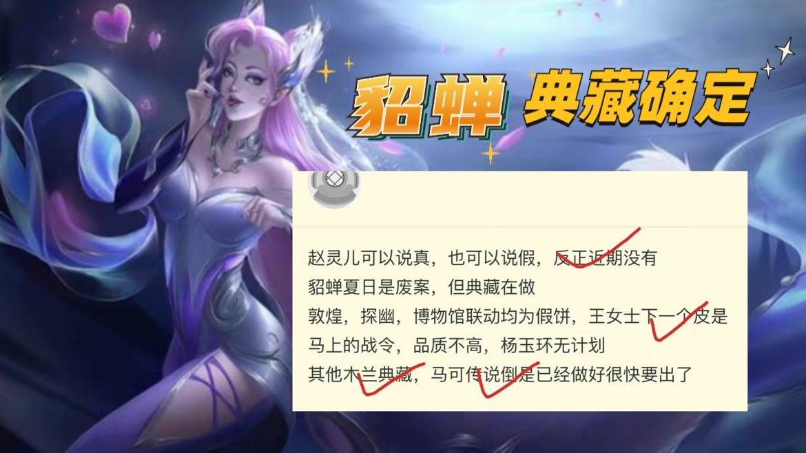 早在好几个月之前,就有一位博主爆料了多个英雄的新皮肤消息,如下图所示,当初博主爆料了西施的赵灵儿,貂蝉的夏日皮肤和典藏皮肤,然后还提到了王昭君的战令皮肤,以及花木兰的典藏和马可波罗的传说皮肤,目前除了貂蝉的荣耀典藏皮肤之外,其他的消息都已经得到了证实。