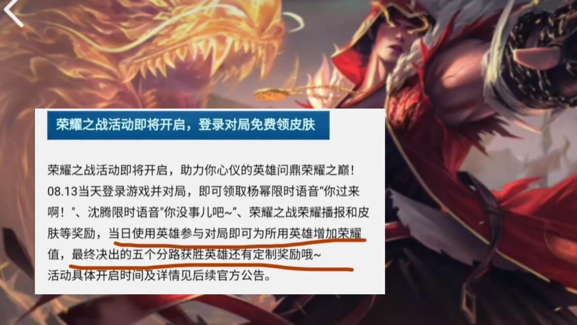 这个月13号王者荣耀将会开启一个新的活动,这个活动叫做荣耀之战,活动的内容是使用英雄进行对战,然后这个英雄就会获得荣耀值,而荣耀值最高的英雄,将会获得订制奖励。