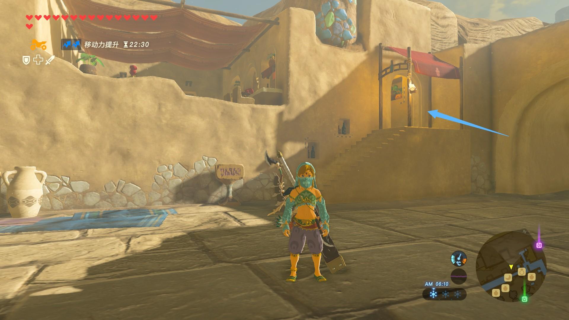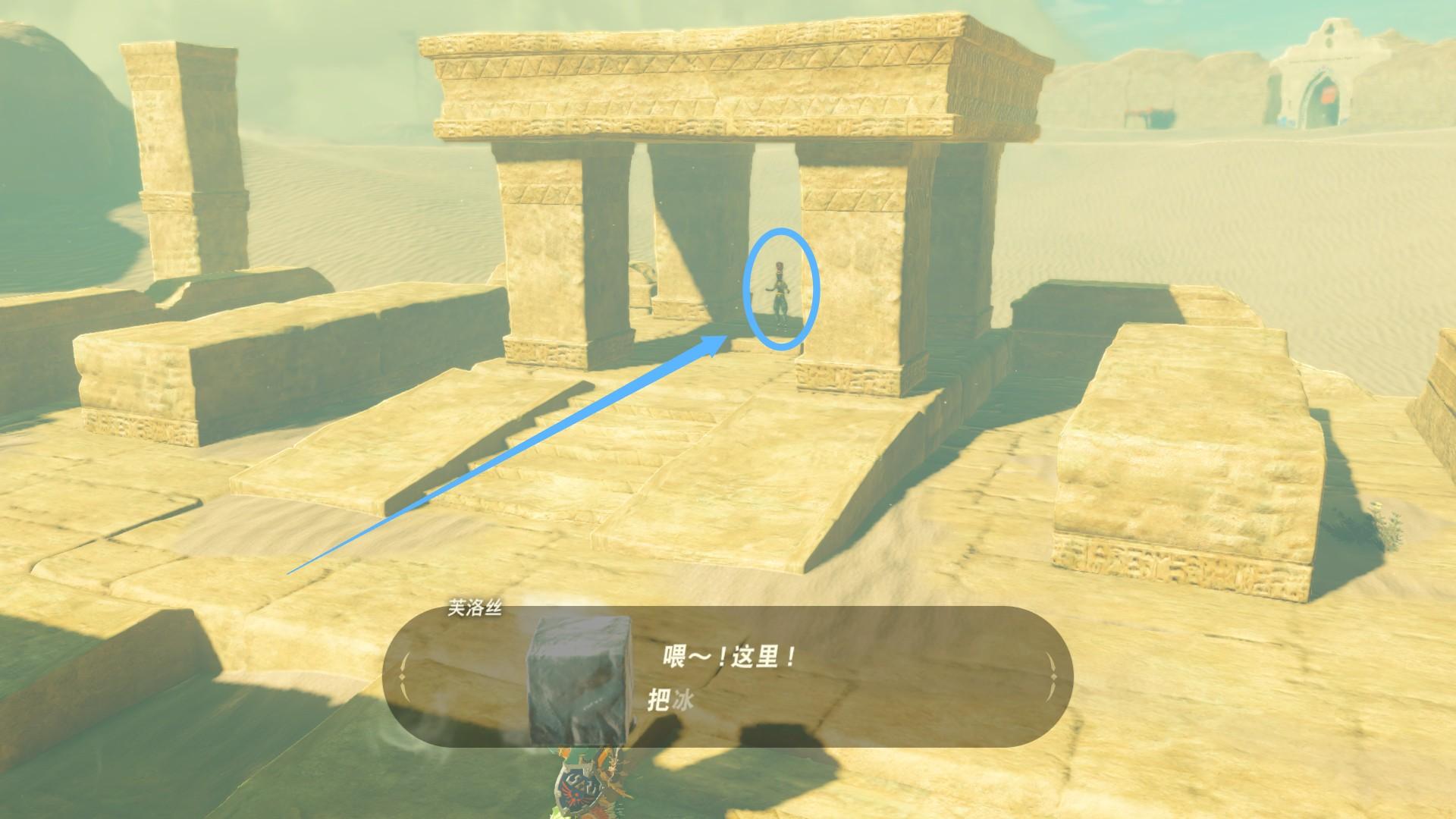 到图示位置的一个岩石上就可以找到神庙,不过开关被一个格鲁德人挡住了,需要给她找到冷饮才可以离开。