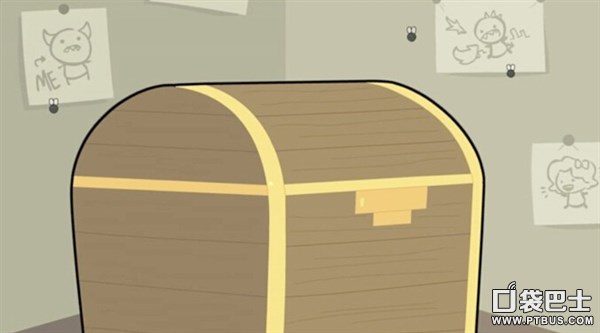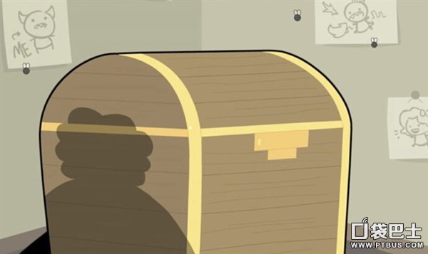 2、镜头转到以撒的房间,可以看到金箱子周围的画,最右是应该以撒带假发的样子,最左是以撒认为自己是罪恶的,中间的画似乎是哥斯拉,以撒应该是把自己当做是破坏一切的罪魁祸首