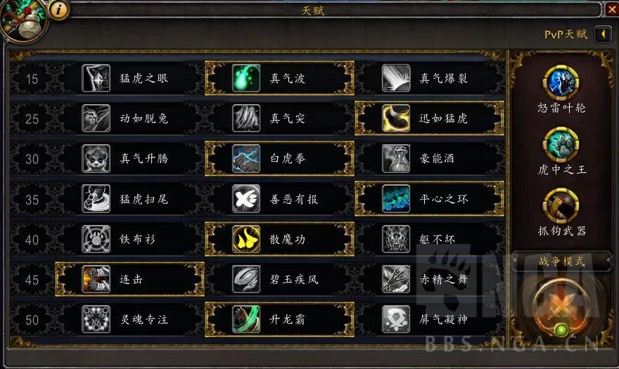 5.pvp天赋选择:虎中之王基本常驻(除非对面组合很容易躲你的爆发)、怒雷叶轮基本常驻(除非对面全法系)、最后一个槽在缴械、反向伤害、隔山打牛里根据实际情况选择。