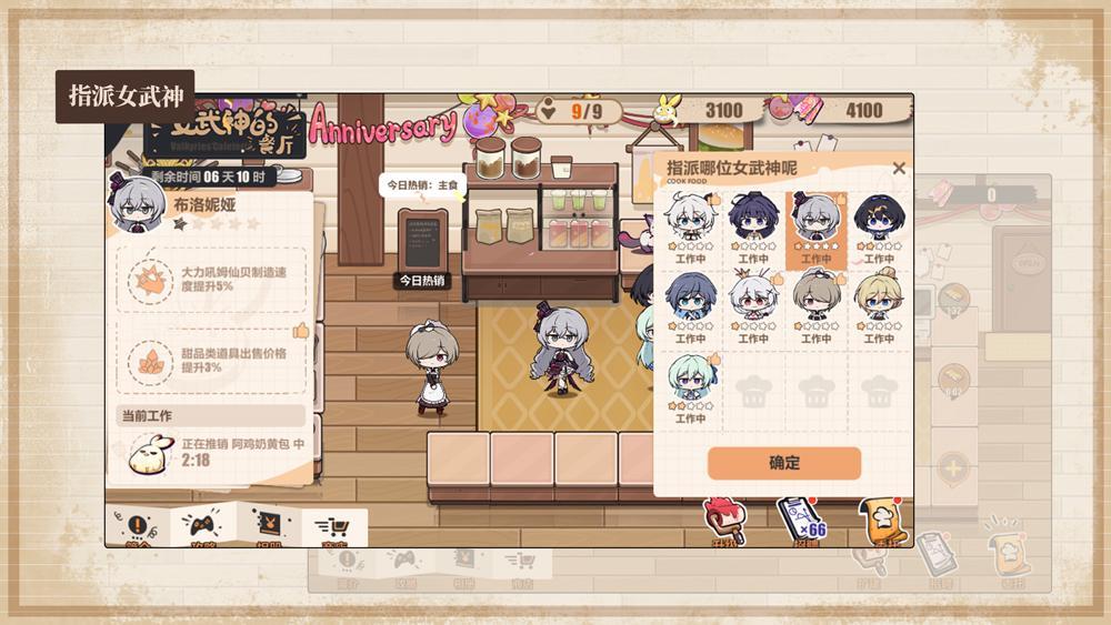 店员技能:每一位女武神制作指定食物时,有不同的技能,如:加速制作、提高出售价格等。