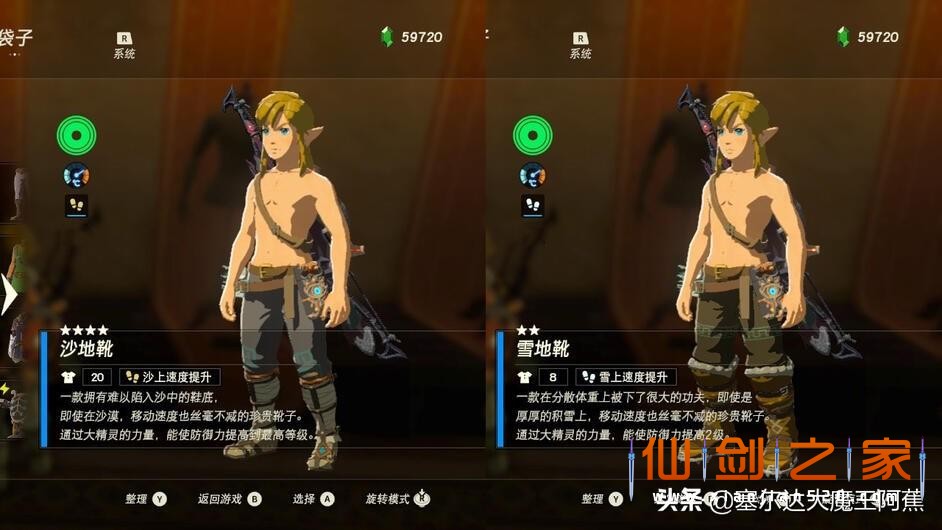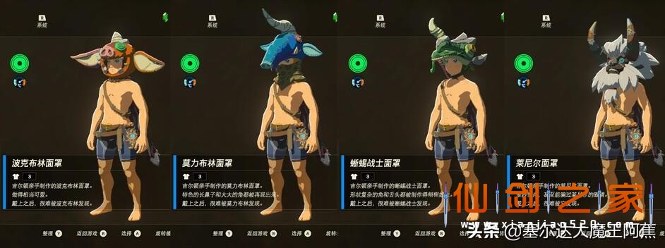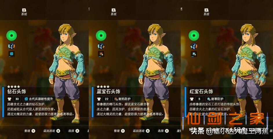 不同的套装具有不同属性,我将其分为两大类:【特殊气候防护类】和【游戏辅助类】。当林克到达雪山、火山、沙漠地区时,需要穿着【特殊气候防护类】服装,相对于料理和药剂,服装的好处就是没有时间限制,同时还能获得诸如“冰冻无效”、“雷无效”等特殊防护效果。【游戏辅助类】服装就更多样了,比如增加攻击效果的蛮族套、鬼神套,防止部分怪物主动攻击的面具等等,我们可以根据自己的需要灵活使用。