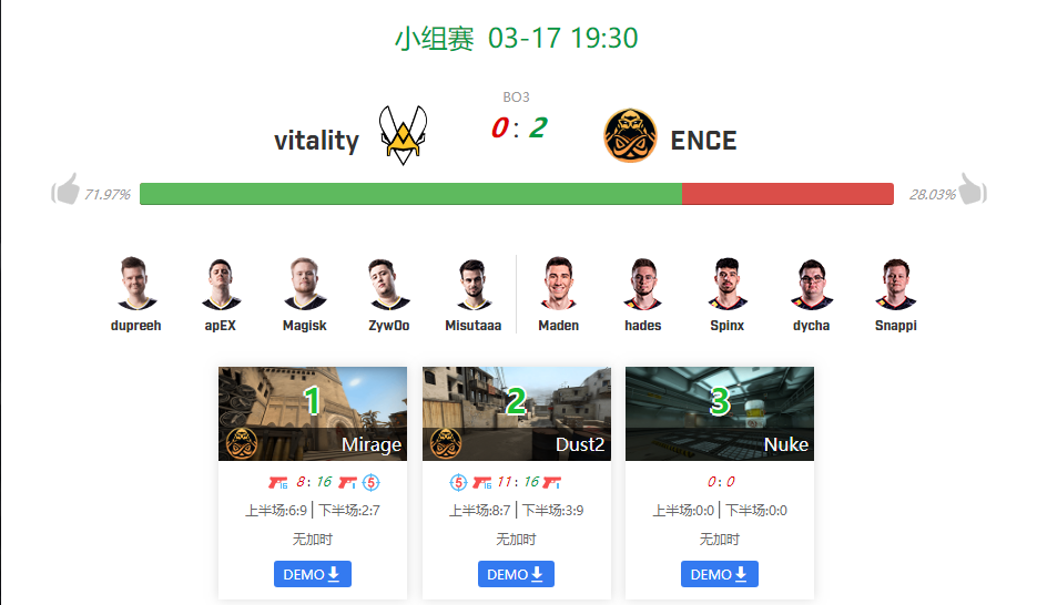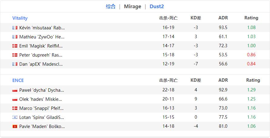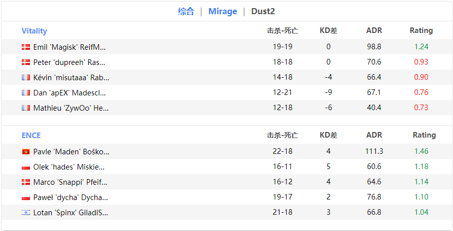 昨天第一个BO3就爆冷,小蜜蜂被ENCE2-0横扫,Zywoo状态有点儿低迷,跟NIKO有的一拼,在第二张DUST2上直接来了个倒数第一,希望他能赶紧找NIKO聊聊,哥俩探讨下病情,找出状态低迷的原因吧抓紧!