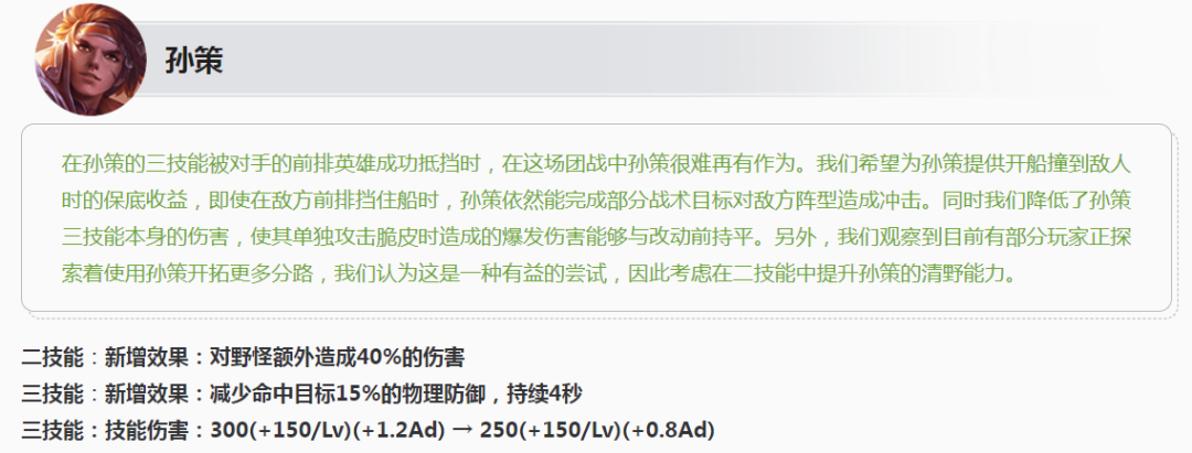 因为一些玩家对于孙策分路玩法的开发,本来是打算让孙策可以走一波打野位的。但正式服更新中,减少了孙策二技能对于野怪的伤害加成,而且也削弱了大招的伤害。