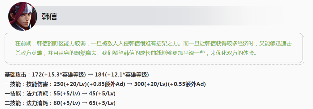 韩信在抢先服被削弱了大招的CD时间。但在正式服更新中,取消了对大招CD的调整。另外还有吕布护盾数值的调整,以及半重塑英雄蒙恬的基础生命值调整。